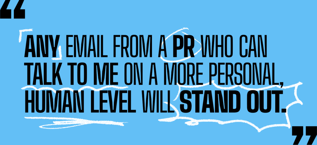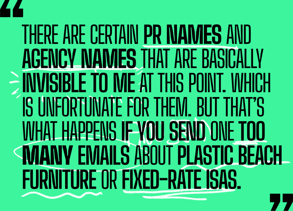 “I’ve got PRs asking me for coverage every second of the day. Some of them know me. Some of them know of me. Some of them aren’t aware of me at all. It’s a churning hellscape in my inbox. I attempt the Zero Inbox thing, and that’s only possible with a kind of dead-eyed, Terminator-style approach to deleting or archiving stuff on sight. There are certain PR names and agency names that are basically invisible to me at this point. Which is unfortunate for them. But that’s what happens if you send one too many emails about plastic beach furniture or fixed-rate ISAs. The ones that I do see tend to be ones that are either from someone I know, or have an appropriate, focused subject line. Generally, they’re also written in an informal, human way. It’s reassuring when it sounds like the person who wrote it is quite busy and is just dropping you a line to let you know something. A 2000-word press release for some debuting NFT rapping hologram feels hilariously misjudged. In a way there’s something poetic about how unreadable, ambient, and pointless they feel. A safe rule of thumb is simply to talk to me like we’re in the pub, so that when I do get a moment to come and meet you for lunch, I know we might actually have a human conversation. No one’s ever actioned an activation in a pub.”