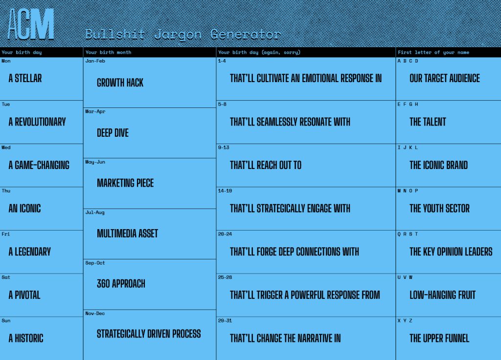 “It just stinks of a lack of independent thought and, ultimately, creativity,” Matt Barr, ACM’s co-founder and CEO, pinged me earlier. “The cliches, the terms, the fact that everyone is suddenly using ‘marketing piece’ and ‘deep dive’ as phrases – agencies are just saying these things because they think they should. They’re not finding the most effective and creative use of language, or even questioning what this set menu of vocabulary is saying about them. It’s so public, too! It’s out there for prospective clients to see. Are you appealing to a new client with your lack of creativity? What does it say about the work you could do for them? The whole thing, it fascinates me.”